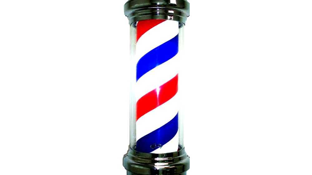 A barber's pole is a type of sign used by barbers to signify the place or shop where they perform their craft. The trade sign is, by a tradition dating back to the Middle Ages, a staff or pole with a helix of colored stripes (often red and white in many countries, but usually red, blue, and white in the United States). The pole may be stationary or may revolve, often with the aid of an electric motor.